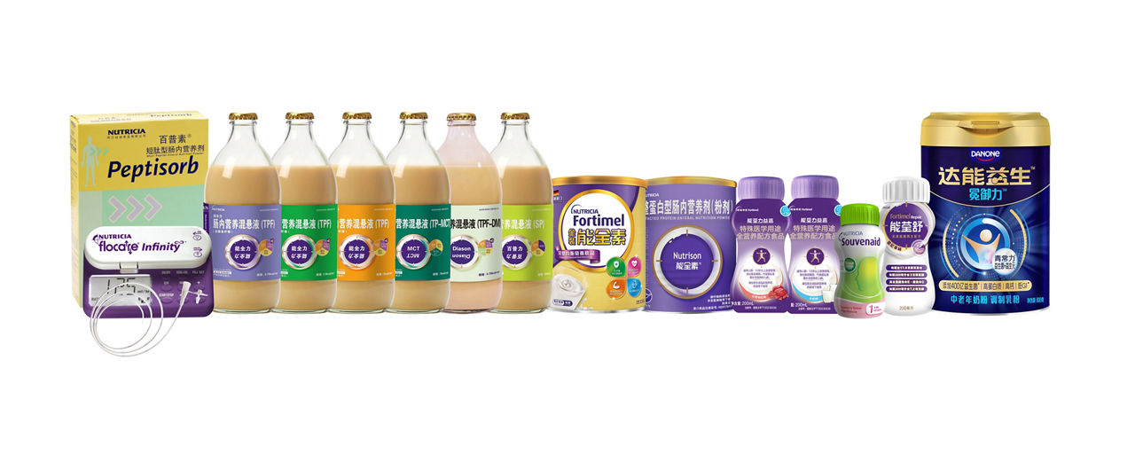 达能成人医学营养业务于1994年进入中国市场,在中国主要生产经营纽迪希亚(Nutricia)品牌的肠内临床营养药品(ECN)、复尔凯肠内营养输注系统(Medical Device)、满足特殊医学用途的配方食品(FSMP)以及专注健康老龄化的达能益生(Danone Yisheng)品牌的中老年奶粉产品。达能成人医学营养打造了能全力(Nutrison MF)、百普力(Peptisorb Liquid)、康全力(Diason)、能全素(Nutrison Powder)、复尔凯(Flocare)、以及智敏捷(Souvenaid)等知名医学营养品牌。