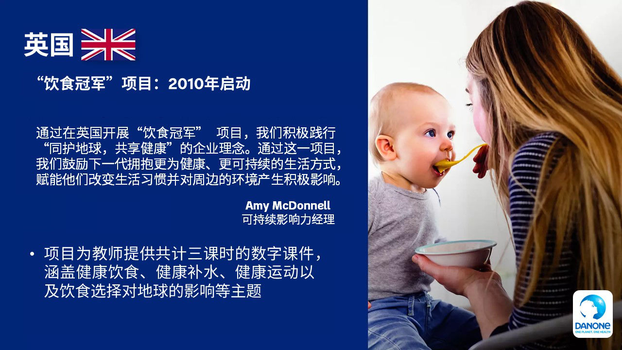 2010年,达能启动了名为“饮食冠军”的教育项目,力求改变英国儿童中日益严峻的营养不良及而肥胖问题。作为一个免费的健康饮食教育项目,“饮食冠军”主要针对9到10岁的小学生,鼓励项目参与者在教育大使的引导下,通过有趣的方式探索更加健康的饮食选择。2020年,该项目在英国为117230名小朋友提供了饮食健康教育。