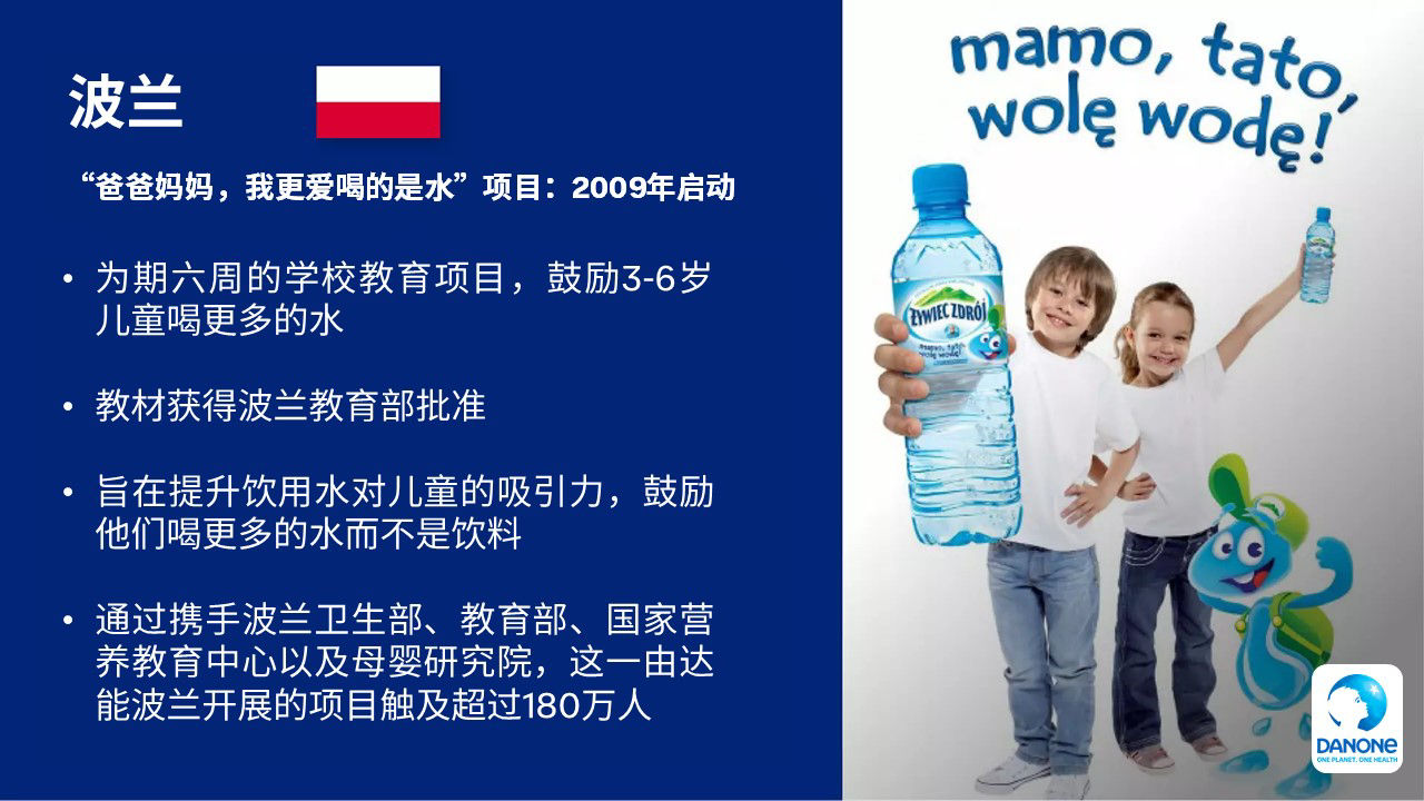 2006年,达能发现,在波兰,仅有12%的儿童通过摄入纯水来补充水分。考虑到日益严峻的肥胖问题,我们启动了“爸爸妈妈,我更爱喝的是水”项目,一个面向儿童、家长和老师的综合性教育项目。该项目目前已在波兰开展了超过15年,触及16000多所教育机构的180余万名儿童。