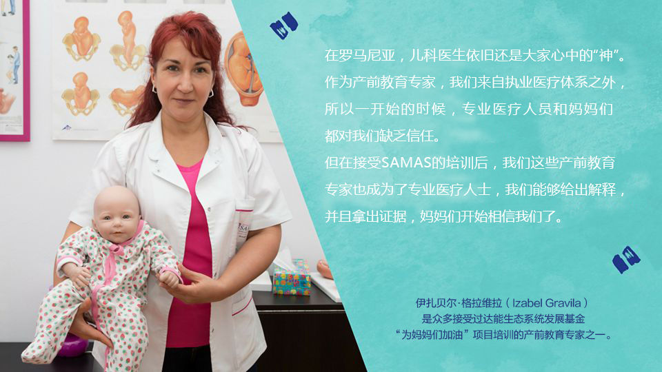 在罗马尼亚,达能生命早期营养和达能生态系统发展基金携手白十字会和罗马尼亚红十字会成立了“为妈妈们加油”(Stand by Mums)协会。该协会是一个由产前教育专家组成的网络,这些专家在接受相关培训后,为当地待产女性提供教育与支持,帮助她们获取与孕期餐饮和婴儿护理有关的专业指导。该项目目前已为超过650名产前教育专家提供了医学与创业培训,并为她们建立起了一个宽广的支持网络。