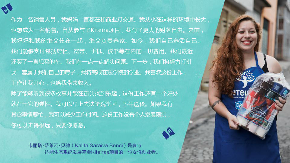 在巴西,我们同梦想世界(Visao Mundial)、创业联盟(Aliança Empreendedora)以及泛美开发银行(IDB)等机构开展合作,通过Kiteiras项目为生活在最贫困社区的妇女赋权。该项目建立了一个上门推销的微分销网络,并为推销人员提供创业、营养知识以及生活技能方面的培训。迄今为止,该项目帮助超过2300人(其中2000名女性)。