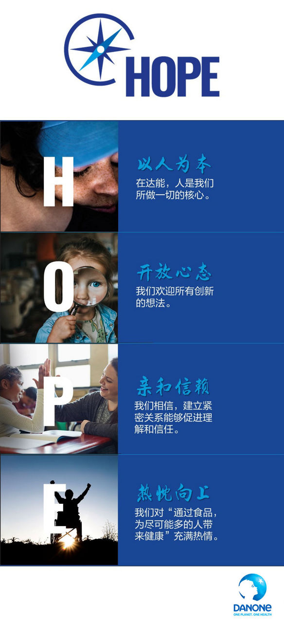 包括“以人为本、开放心态、亲和信赖、热忱向上”的HOPE价值观对于达能拥有重大意义。作为“道德指南针”,HOPE价值观在达能人面对艰难取舍或不确定性的情况下指引如何做出正确选择。