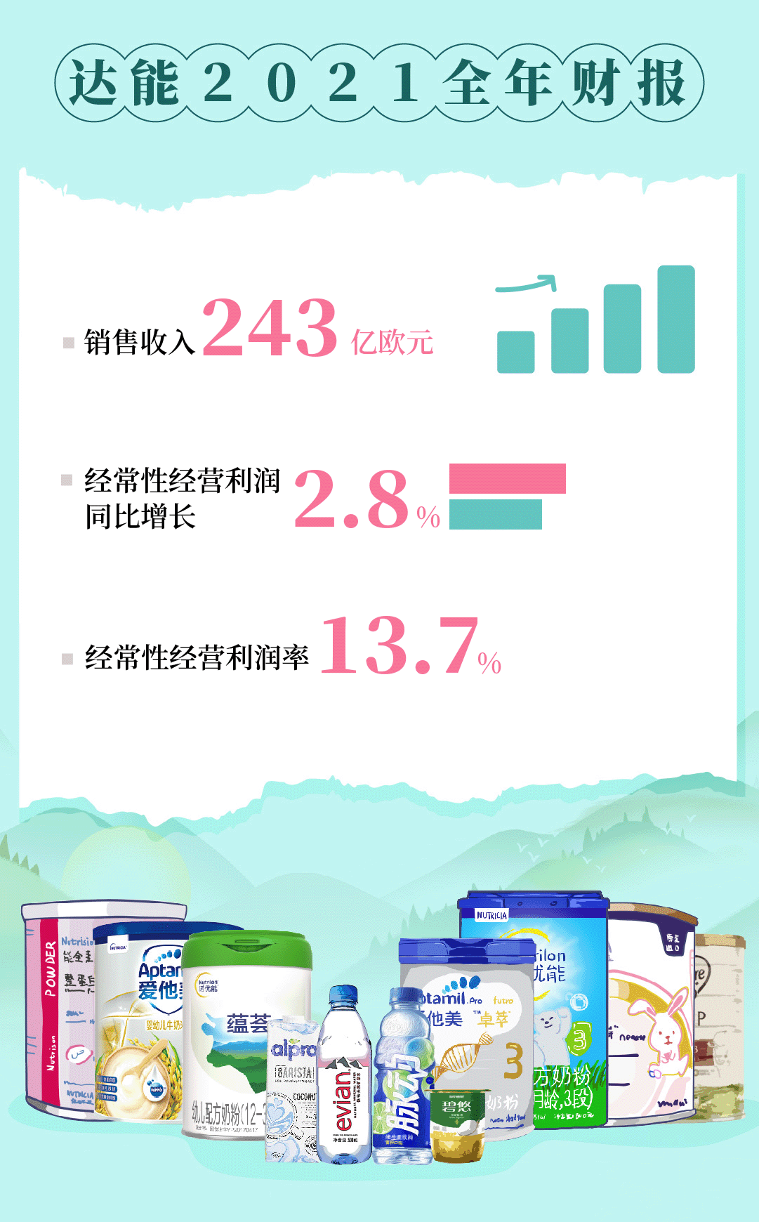 达能今天发布的2021年财报显示,公司去年销售收入同比增长3.4%至243亿欧元,经常性经营利润同比增长2.8%至33亿欧元,经常性经营利润率为13.7%,同比微降9个基点。