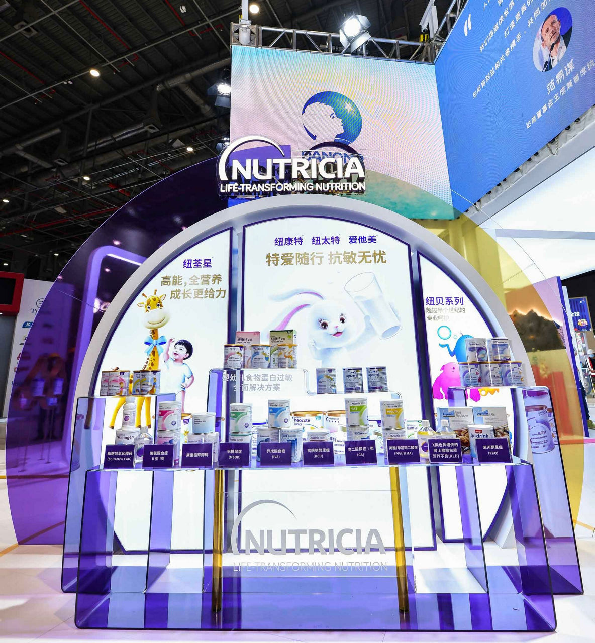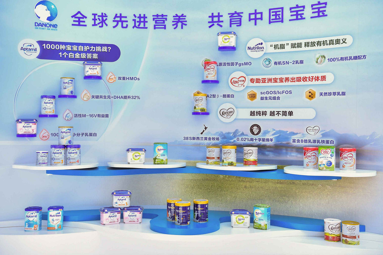 今年,蓝色的爱他美、绿色的诺优能、橙色的禧贝、紫色的纽康特、粉色的依云……在达能展位里,来自全球十多个国家和地区的近200款产品组成一道营养“彩虹”,打造出一个满足从生命早期1000天到老年健康的全生命周期营养解决方案。
