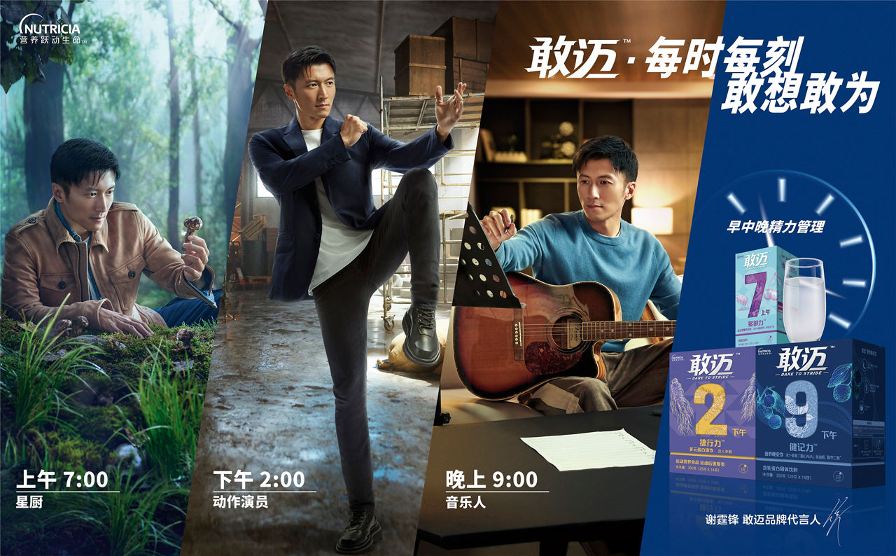 品牌代言人谢霆锋与敢迈™倡导的“对的时间补充对的营养”理念不谋而合。这三款产品基于人体生物钟理念,倡导早中晚精力管理。根据早中晚适宜的行为习惯,提供分时健康系列“按需分时”的科学营养配方,从“自护力”、“行动力”等多个维度,将营养补充融入日常生活,确保在每个时间都有好状态。