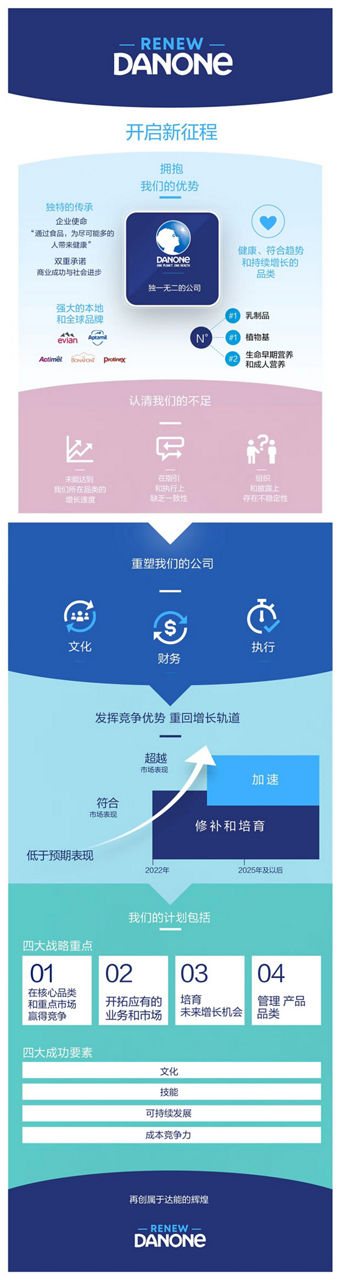 3月8日, “Renew Danone”战略计划发布。该计划以四项战略支柱为核心,包括重塑达能在核心品类和重点市场的竞争力、有选择地开拓公司的业务、积极布局未来增长路线和积极进行产品组合轮换。这项计划将助力达能重回可持续盈利性增长模式。