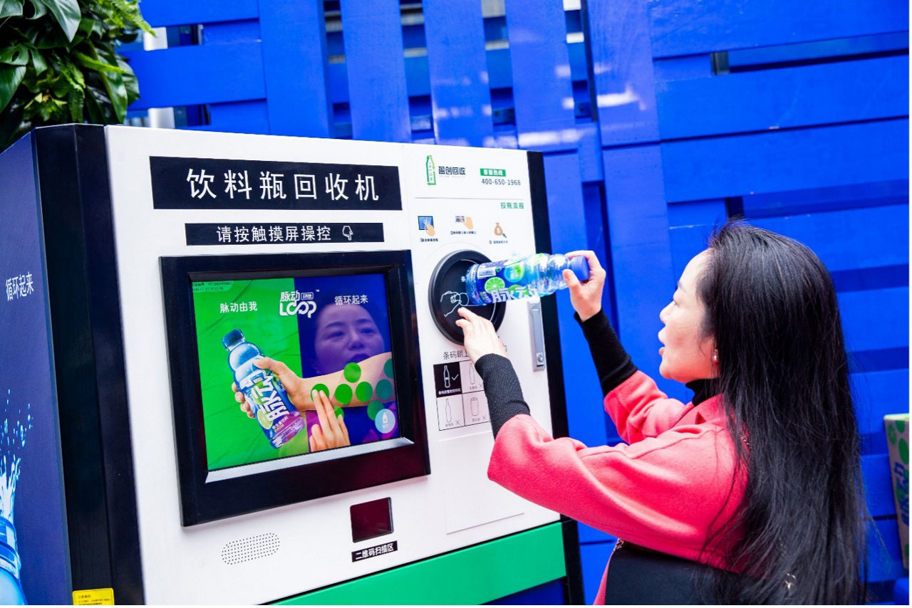 周末,在上海市中心人民广场的一个商场内,几个年轻人围在一台“脉动塑料瓶智能回收机回收机”前,将瓶身条形码朝上投入空瓶,亲眼目睹着塑料瓶开启再生之旅。同时,也从机器上领用了一张脉动产品优惠券。