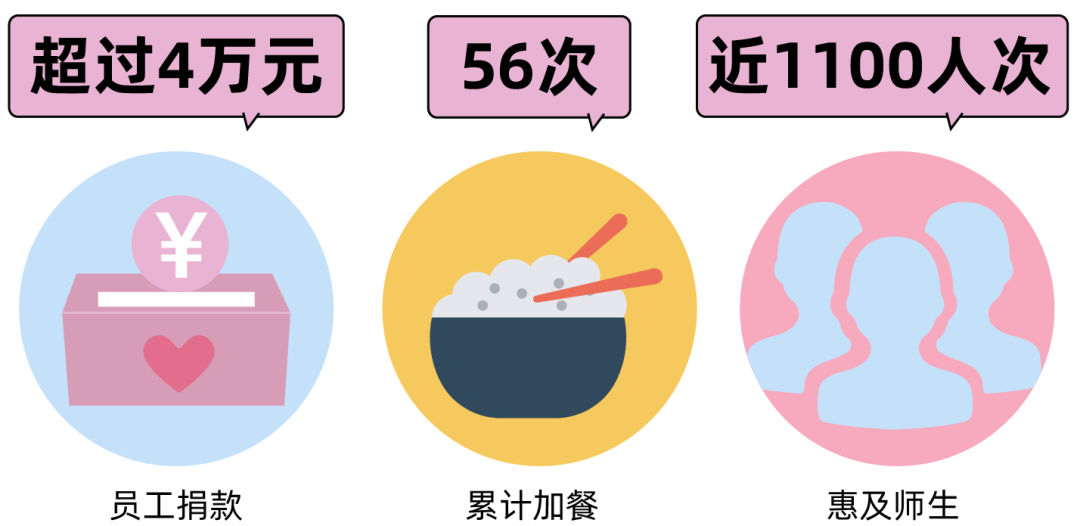 截至2020年7月,“特爱加餐”项目的员工捐款累计超过了4万元,累计加餐56次,惠及师生近1100人次。