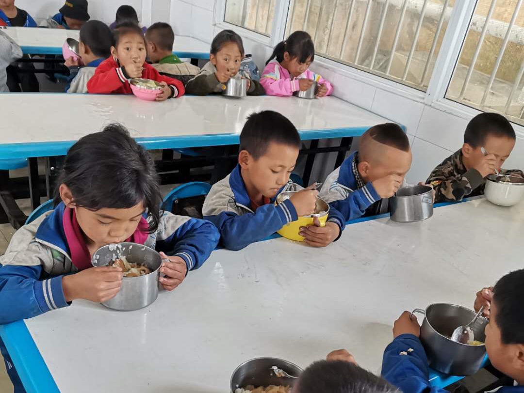 云南宁蒗县大水沟完小的孩子们手里捧着餐盘,挨个儿走到窗口前,满怀期待地看着师傅把一大勺热腾腾的猪肉白菜盖在米饭上,眼睛里都是小星星。